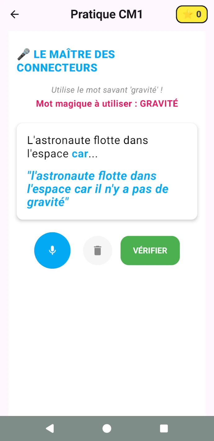 Construisez des phrases en utilisant des mots obligatoires, la voix est transcrite, transformée en texte et analyser pour vérifier si elle correspond aux attentes