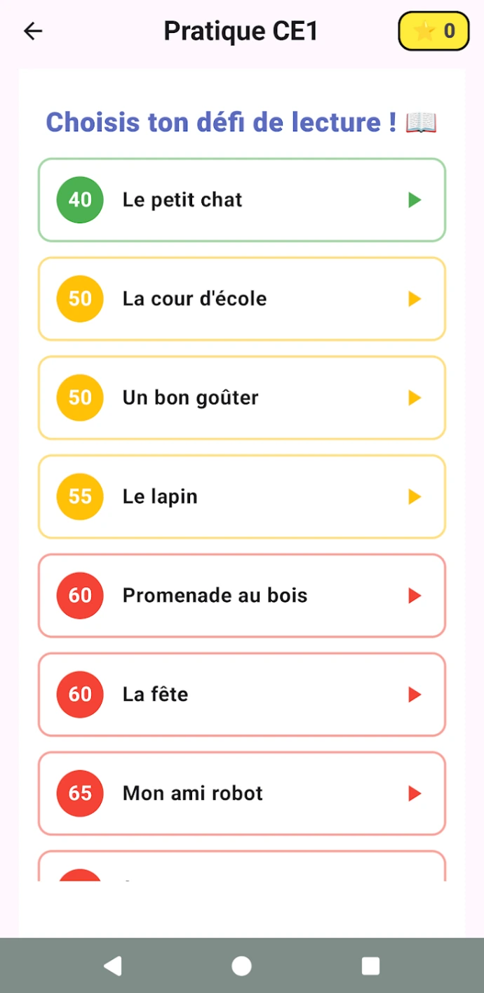 Objectif 40 / 50 / 55 / 60 / 65 / 70 mots de lecture par minute.